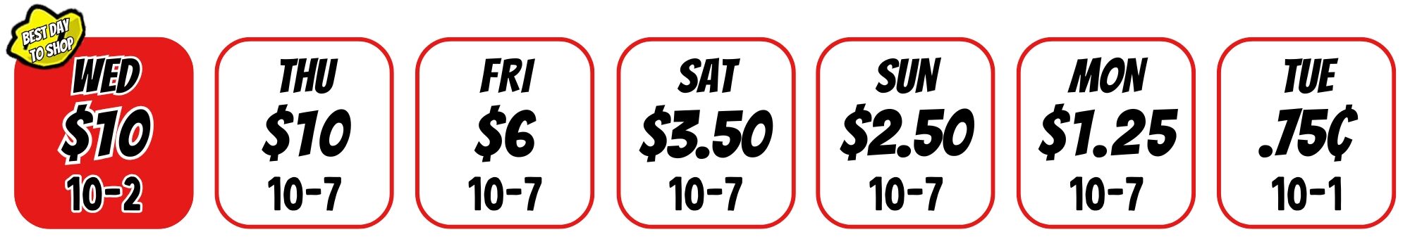 for special events and changes to Store Hours & Pricing (subject to change).